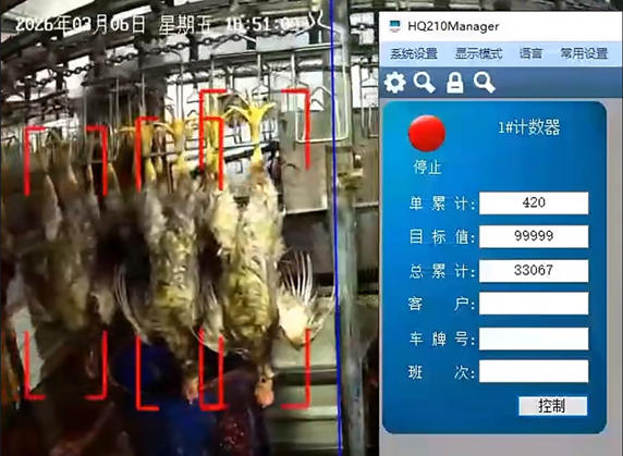 畜禽屠宰(鸡鸭鹅鸽子、猪牛羊)行业,精准计数长期是生产管理核心瓶颈:畜禽个体身形、毛色差异大,悬挂姿态多变(单/双脚吊挂、肢体倾斜、晃动偏移),叠加产线运行颠簸摆动;加之车间高湿、水汽浓重、血污/鸡毛/粉尘飞溅,传统计数方式误差率居高不下。